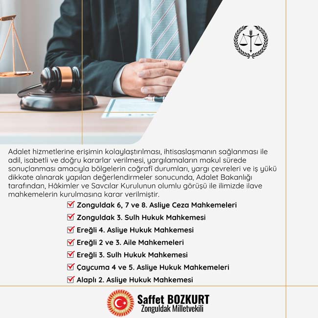 AK Parti Zonguldak Milletvekili Saffet Bozkurt,Zonguldak ili başta olmak üzere Ereğli, Çaycuma ve Alaplı’da yeni mahkemeler kurulacağına dair yaptığı açıklamada şu görüşlere yer verdi;