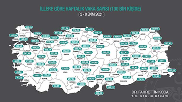 2-8 Ekim arasında ildeki durumu gösteren haftalık insidans haritasında en çok vaka görülen il, 551,76 ile Zonguldak oldu. Zonguldak'ı 538,56 ile Kastamonu ve 522,39 ile Düzce izledi. 100 bin kişide en az vaka görülen il 33,41 ile Van oldu. Van'ı sırasıyla 39,42 ile Şırnak ve 43,21 ile Antalya izledi.