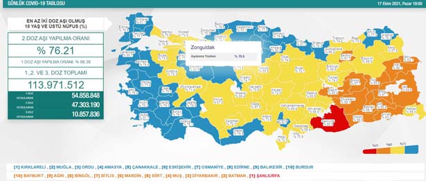 Sağlık Bakanlığı tarafından açıklanan tabloda, aşılama verilerine de yer verildi. 18 yaş üzeri nüfusu kapsayan verilere göre Türkiye'de 2. doz aşılama ortalama yüzde 76,21 oldu. 1. doz ortalaması yüzde 88,38 olurken, 1., 2. ve 3. doz aşısını olan vatandaş sayısı toplamda 113 milyon 971 bin 512’e yükseldi.