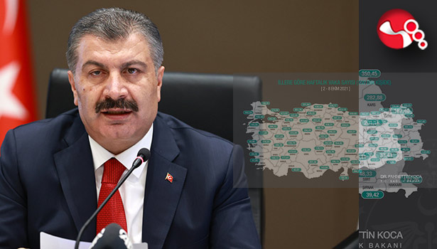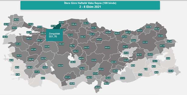 2-8 Ekim arasında 100 bin kişide görülen haftalık vaka haritası açıklandı. Zonguldak, 551,76 ile en fazla vakanın görüldüğü il oldu. 25 Eylül – 1 Ekim haftasında 557,17 ile en fazla vakanın görüldüğü Zonguldak, yeni hafta da insidans haritasında 551,76 ile ülke genelinde zirvede yer aldı.