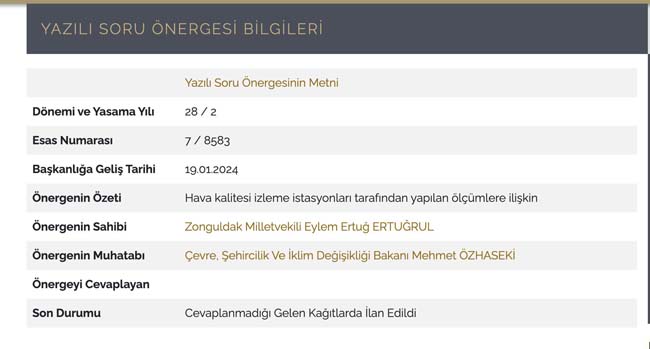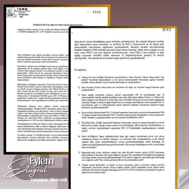 “Türkiye’de vatandaşlarımız bir yıl boyunca her şehirde günün bazı saatlerinde anne karnındaki bebeğin beyin gelişimini bile olumsuz etkilediği bilinen değer üzerinde kirli havaya maruz kalıyor. Çevre ve Şehircilik Bakanlığı Ulusal Hava Kalite İzleme Ağı’nın gün ve saat bazında kontrol ettiği ve paylaştığı hava kalitesini gösteren değerler, Türkiye’de yaşayan insanların 24 saat boyunca zehir soluduğunu ortaya çıkarıyor. Zonguldak’ta hava kirlilik değerleri günlerdir kritik düzeyde seyrediyor. Çevre ve Şehircilik Bakanlığı Ulusal Hava Kalitesi İzleme Ağı verilerine göre “kötü” olarak nitelenen hava kalitesi, uluslararası izleme ağların verilerinde “sağlıksız” olarak niteleniyor. Hava kalitesinin “kötü” olarak nitelendiği şartlarda, herkes için sağlık sorunlarının ortaya çıkması beklendiği gibi, hassas gruplar için çok ciddi sağlık sorunlarının ortaya çıkması olası sonuçlar arasında sayılıyor. Geçtiğimiz Ocak ayında, Zonguldak’ta özellikle Ereğli ilçesinde bulunan fabrikalar sebebiyle oluşan hava kirliliğinin bölge halkı için taşıdığı riskleri ve bölgede bulunan hava kalitesi izleme istasyonlarının etkinliğini Çevre ve Şehircilik Bakanı Mehmet Özhaseki’ye yanıtlaması istemiyle sorduk.