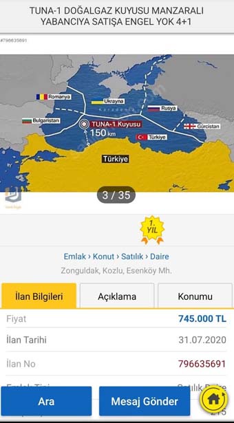 Müjdenin açıklanmasının yankıları devam ederken Zonguldak'ta bir ev sahibi ise ilginç bir yola başvurdu. Bir internet sitesine "Tuna-1 doğalgaz kuyusu manzaralı yabancıya satışa engel yok 4+1" şeklinde 745 bin liraya ilan veren ev sahibi C.Ö., ilanın yayınlanmasının ardından kısa süreli şaşkınlık yaşadı.