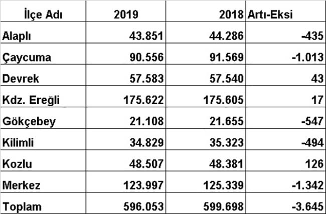 TÜİK verilerine göre, Zonguldak’ın 2018 yılında 599 bin 698 olan nüfusu, 2019 sonunda 3 bin 045 kişi azalarak 596 bin 053 kişiye geriledi.