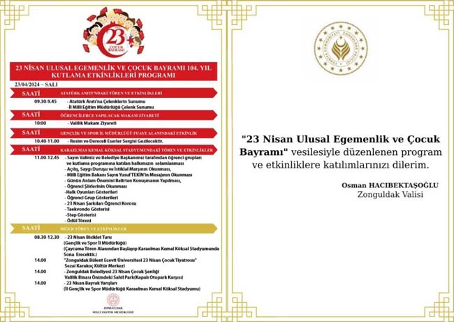 Zonguldak’ta 23 Nisan Ulusal Egemenlik ve Çocuk Bayramı düzenlenecek törenlerle kutlanacak.