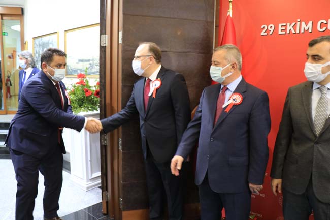 Saygı duruşunun ardından İstiklal Marşı'nın okunduğu törende Cumhurbaşkanı Recep Tayyip Erdoğan'ın telgrafı okundu. Vali Mustafa Tutulmaz ve Belediye Başkanı Ömer Selim Alan törene katılanların bayramını tebrik etti. Törende konuşan Vali Mustafa Tutulmaz, "Türkiye Cumhuriyeti'nin kuruluşunun 98. yıldönümünü Büyük Önder Atatürk'ün söylemiyle en büyük bayramımız olan Cumhuriyet Bayramı'nı büyük bir sevinç, coşku ve heyecan içerisinde kutlamanın gururunu yaşıyoruz. Büyük Önder Atatürk'ün 19 Mayıs 1919'da Samsun'da başlattığı, bağımsızlık, özgürlük ve kurtuluş mücadelesini asil milletimiz ve onun bağrından çıkan kahraman ordumuzun azim, inanç ve kararlılığı ile başarıyla yürütülmüş. Tarihin akışını değiştiren büyük bir zaferle taçlandıran bu zorlu mücadele sonucunda Büyük Türkiye Cumhuriyeti Devleti kurulmuştur" ifadelerine yer verdi.