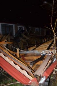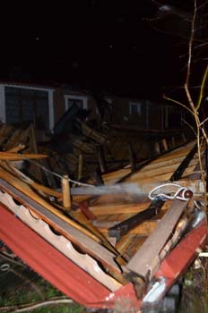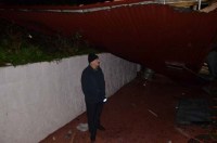çatısı fırtınada uçtu. Uçan çatı, evin yanındaki demir elektrik direğini yıktı.