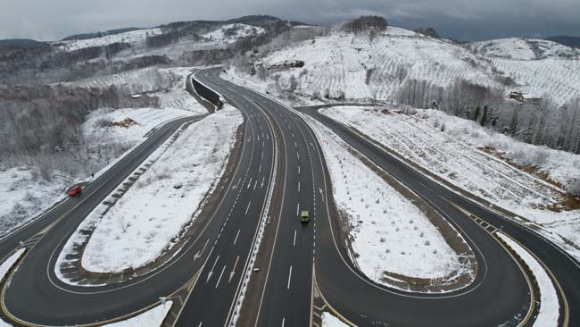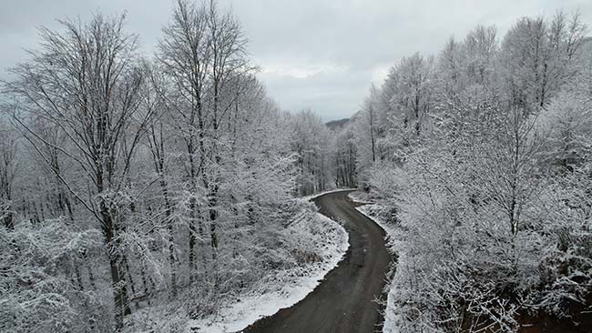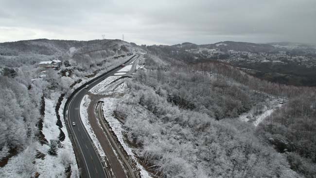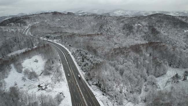 Zonguldak'ta kuvvetli kar uyarısının ardından gece saatlerinden itibaren etkili olan kar yağışı yüksek kesimlerde kartpostallık manzaralar oluşturdu. Havadan görüntülenen Zonguldak-Ereğli kara yolunda gece saatlerinden itibaren tuzlama çalışmaları yapıldı.