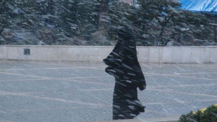 Valilik önünde kar yağışının fotoğrafını çekmek isteyen iki kadın zor anlar yaşadı.