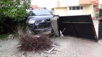 Bina sakinlerinin gürültüye koştuğu kazada bahçe duvarı faciayı önledi. Kaza anı ise saniye saniye güvenlik kameralarına yansıdı.
