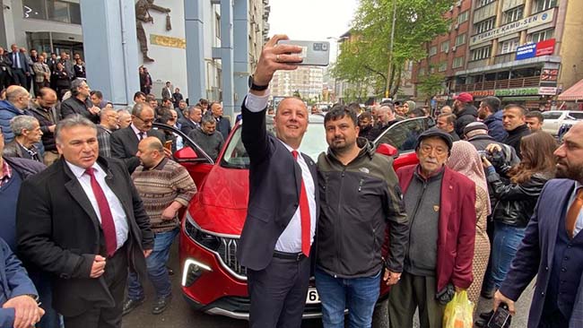 Yerli ve milli araç Togg Zonguldak’a geldi. Togg'un direksiyonuna geçerek Zonguldak Belediye Başkanlığı binasının önüne getiren Belediye Başkanı Ömer Selim Alan, vatandaşlarla fotoğraf çektirdi.