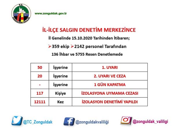 Zonguldak Valisi Mustafa Tutulmaz'ın da yer aldığı il ve ilçe denetimlerinde kurallara uymayanlara ceza uygulandı. İl genelinde 15 Ekim 2020 tarihinden itibaren 359 ekip 2 bin 142 personel tarafından 136 ihbar değerlendirildi. 5 bin 755 re'sen denetleme gerçekleştirildi. Buna göre 50 iş yerine 1. uyarı, 20 iş yerine 2.uyarı ve ceza, 117 kişiye izolasyona uymama cezası verilirken 12 bin 111 izolasyon denetimi yapıldı. Korona virüsle mücadelede denetimlerin aralıksız devam edeceği ve vatandaşların kurallara uymaları gerektiği belirtildi.