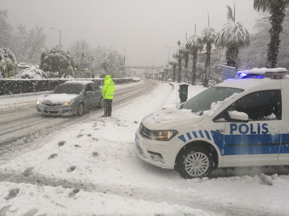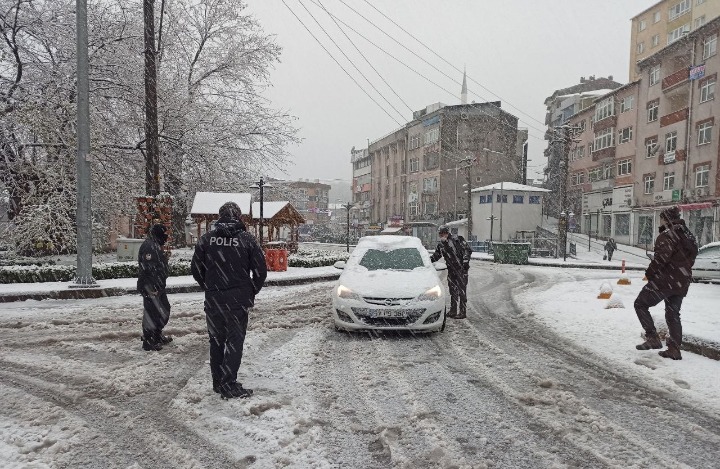 İlçenin belirli noktalarında uygulama yapan; Trafik, Asayiş, Karakol ve diğer birimlerdeki polis ile yardımcı güç Bekçiler, kar yağışına rağmen uygulamalarını sürdürüyorlar.